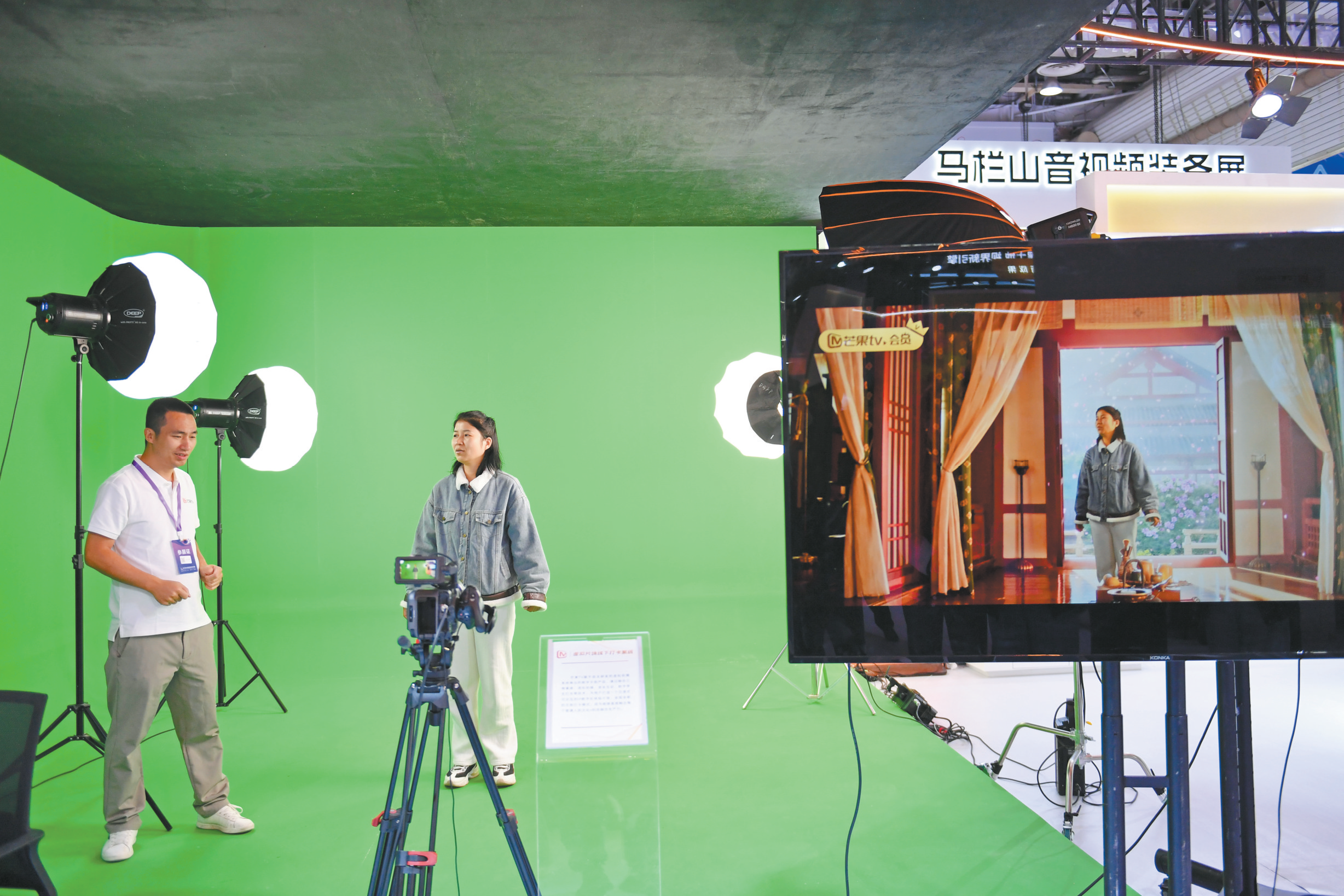 11月12日,观众在2025中国新媒体技术展上体验虚拟片场线下打卡系统。