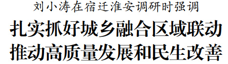 交汇点讯11月15日至16日,省长刘小涛在宿迁市、淮安市调研。他强调,要深入学习贯彻党的二十届四中全会和习近平总书记对江苏工作重要讲话精神,完整准确全面贯彻新发展理念,发挥比较优势、坚持各扬所长,做好区域互补、跨江融合、南北联动大文章,扎实推进乡村全面振兴,促进城乡融合发展、区域协调发展,让现代化建设成果更多更公平惠及广大群众。