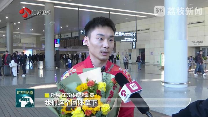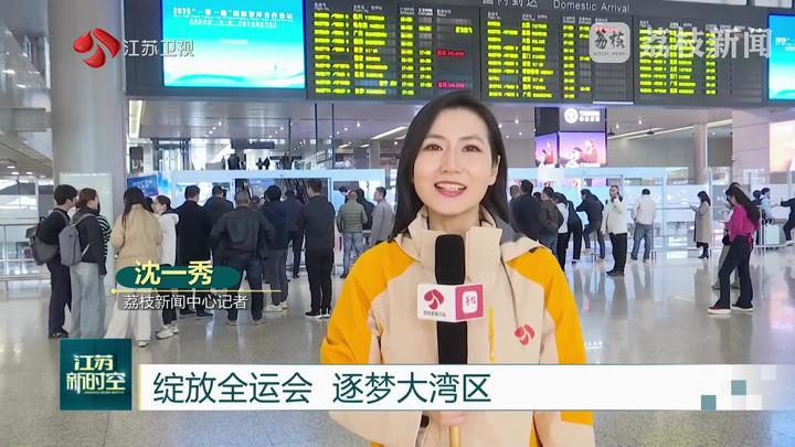 荔枝新闻中心记者沈一秀说:“我现在是在南京禄口国际机场,18日下午,从大湾区全运会赛场载誉而归的江苏健儿们,陆续抵达南京。”