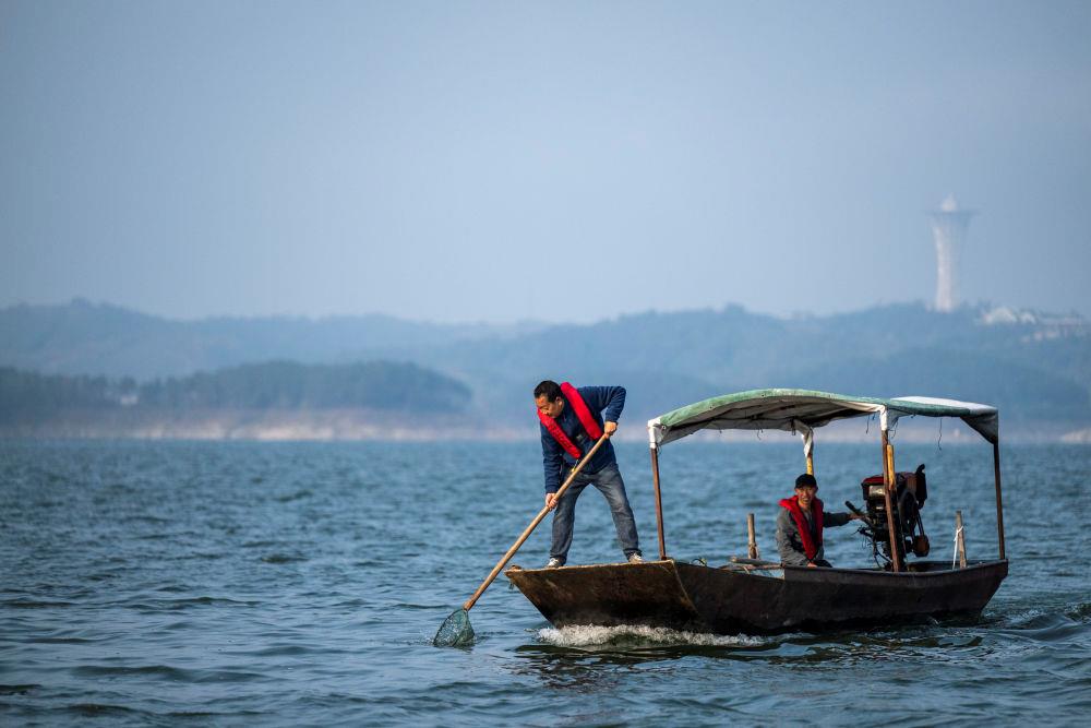△2024年10月28日,湖北十堰丹江口清漂队队员在库区进行清漂作业。2023年,丹江口成立“小水滴”守水护水志愿服务队,越来越多人加入守水护水行列。
