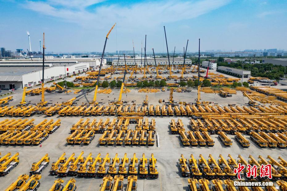 资料图:徐工集团生产车间外停放的起重机。(无人机照片)泱波摄