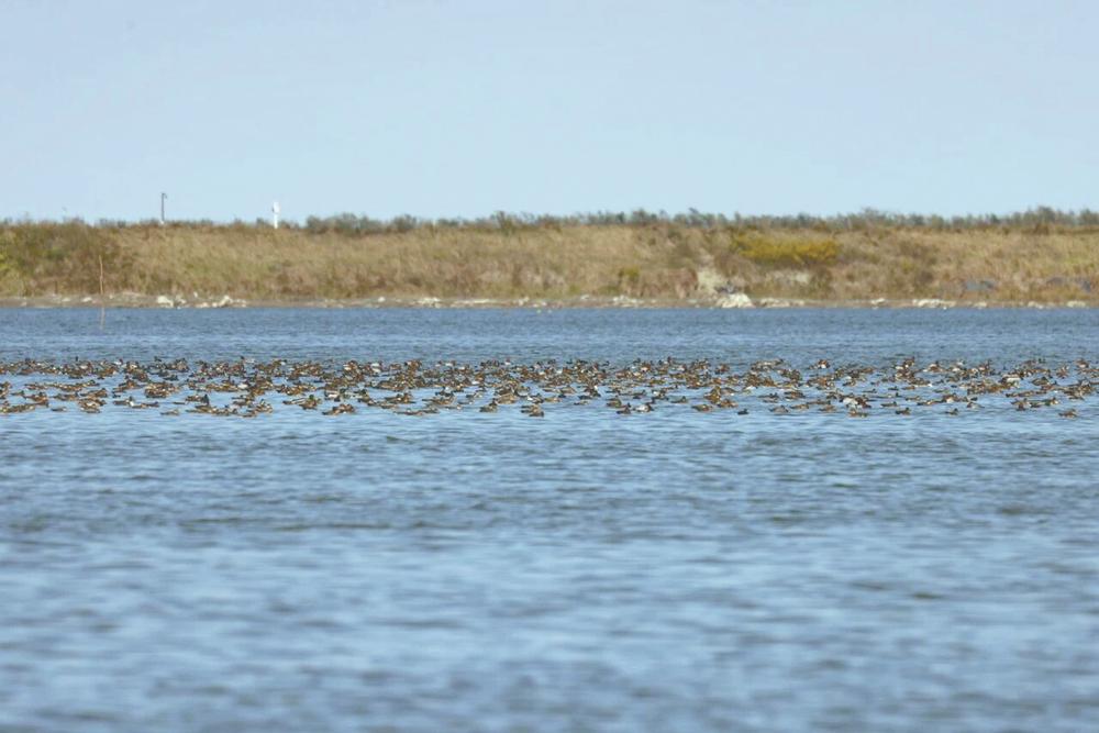 此外,调查员还在川水湾修复区记录到38种水鸟,总数约有1.4万只。数量最多的四种鸟类是骨顶鸡、红头潜鸭、罗纹鸭和赤颈鸭,分别有3654只、2582只、1437只和1421只。在方塘河口的高潮地记录到近2万只鸻鹬,其中有4650只白腰杓鹬,是近期调查中记录到数量最多的。卷羽鹈鹕在方塘河口和条南沙洲也有稳定地出现,两天调查分别记录到24只和16只。