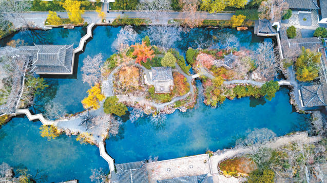 12月16日拍摄的江苏苏州拙政园冬景(无人机照片)。