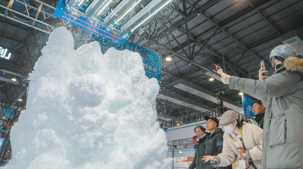 12月18日,参观者在第九届吉林冰雪产业国际博览会现场参观展出的国产造雪机。