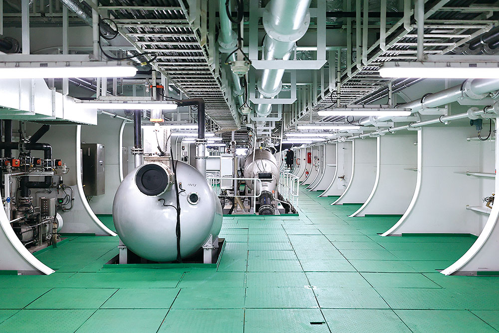 船上配备的全船智控系统,可对水体、氧气、饲料投喂量等进行精准管理。饲料通过密闭管道自动、精准送达,封闭式循环系统24小时内可完成16次水体交换,鱼群生长数据实时回传至控制中心,这些都为三文鱼提供了洁净、稳定的“宜居环境”。