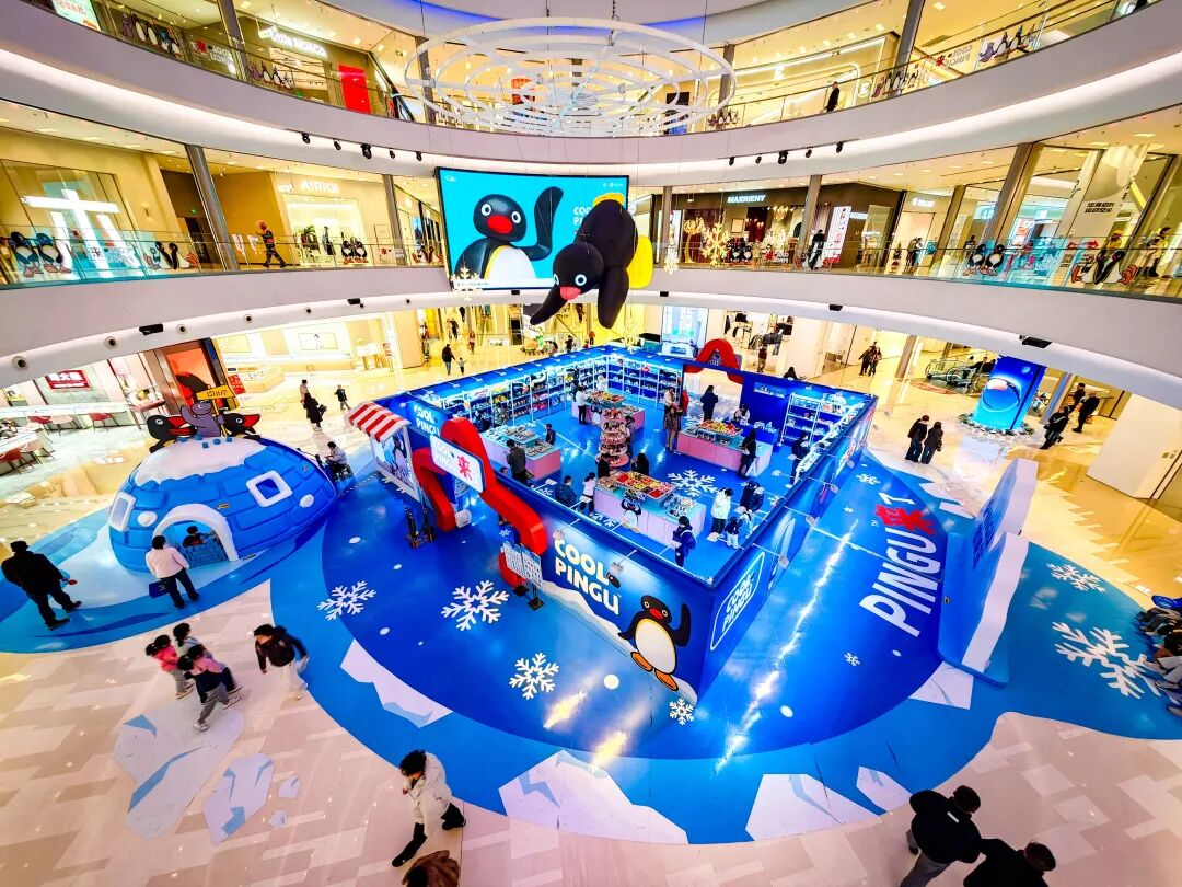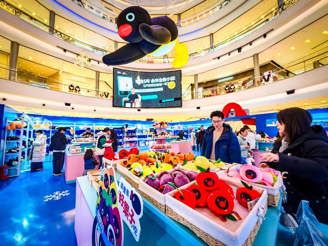 蓝白色调的“冰雪”场景中,冰屋装置错落有致,许多消费者举起手机与企鹅合影。在华采天地,经典动画形象Pingu(企鹅)主题展暨快闪店江苏首秀成为商场的“吸睛王”,琳琅满目的主题周边更是吸引了许多年轻人的目光。“我非常喜欢这个动画,专门来看展,现场的场景非常出片,我还买了不少周边,一会儿就发朋友圈‘秀’起来。”“00后”市民曹萌举着刚买的企鹅玩偶开心地展示。