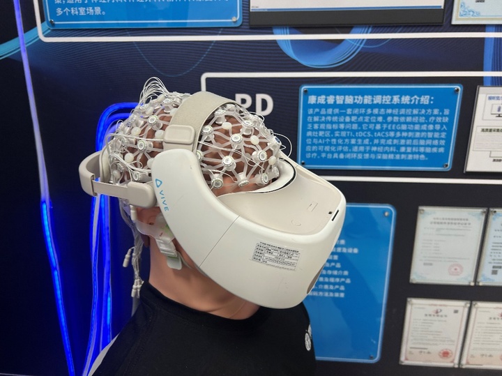 在戴亚康团队的实验室,记者看到了团队研发的最新款无线可穿戴脑电采集系统,2024年,记者也曾探访该团队实验室,相较于去年的产品,新款脑电帽更加精细,还新增了VR交互功能。