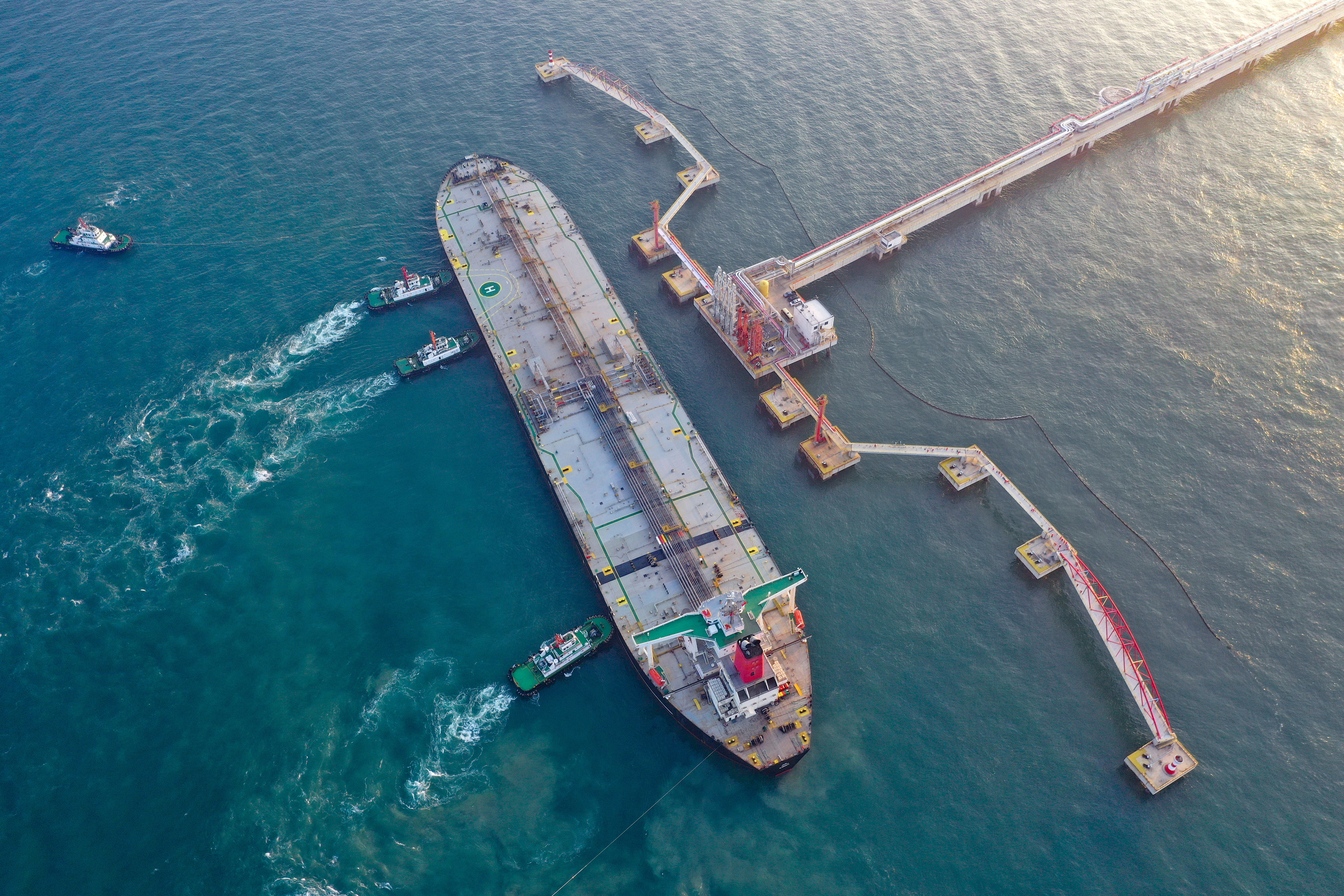 △2025年12月18日,一艘装载着17.9万吨石化原辅料的船舶泊入位于海南省儋州市的国投洋浦油储码头30万吨级原油泊位(无人机照片)。