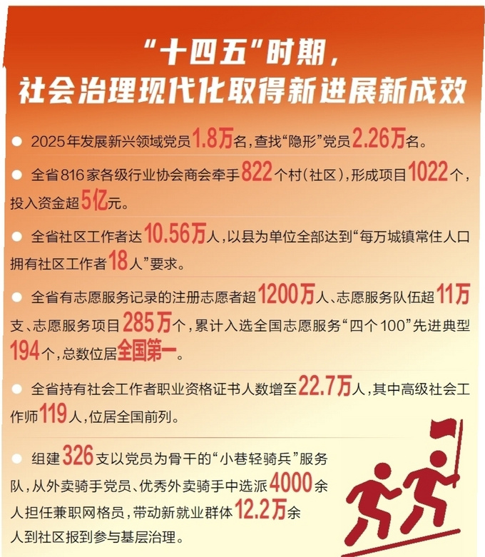 “十四五”时期,我省锚定“高效能治理”目标,着力完善社会治理体系,社会工作体制机制更加健全,党在新兴领域的号召力、影响力、凝聚力不断增强,党建引领基层治理和基层政权建设得到夯实,凝聚服务群众工作质效持续提升。