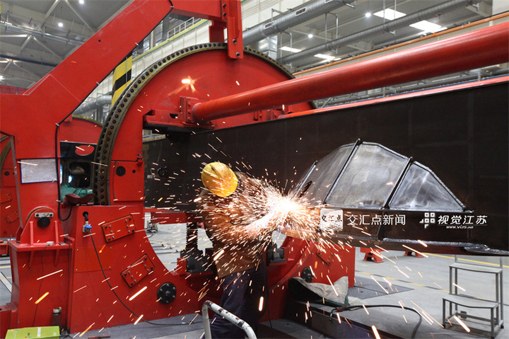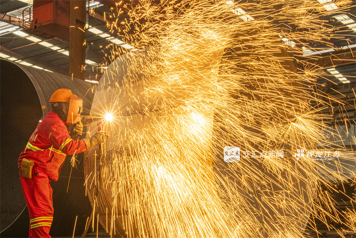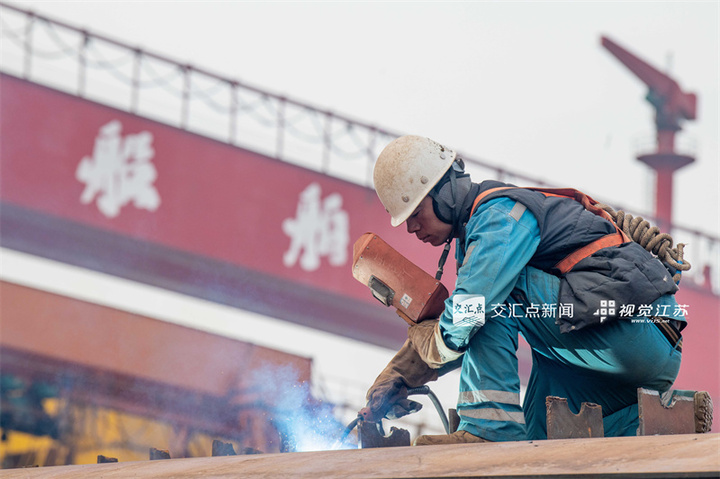 1月5日,工人在泰州口岸船舶有限公司厂区内进行焊接作业。新年伊始,泰州市造船企业厂区内一派繁忙景象,工人抓紧建造各类大型船舶。杨玉岗吴剑摄视觉江苏网供图