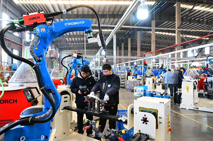 1月8日,徐工重型机械有限公司高端起重装备及大吨位起重机领航级智能工厂内一派火热的生产场景。蒯创摄视觉江苏网供图
