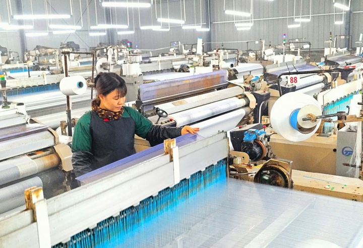 1月7日,工人在沭阳县塘沟镇工业集中区的宿迁润辉纺织有限公司生产车间内,操控喷水织机赶制一批出口非洲的化纤面料订单。丁华明摄视觉江苏网供图