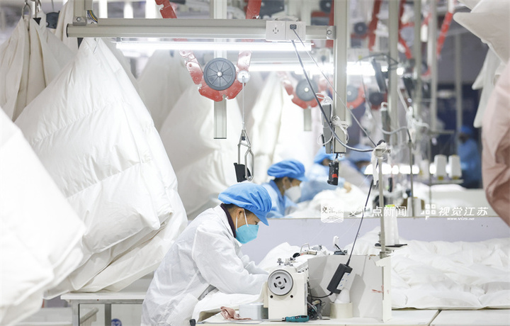1月6日,淮安市淮安区,工人在江苏康乃馨集团加工羽绒被、枕头等床上用品,车间内一派忙碌景象。赵启瑞摄视觉江苏网供图