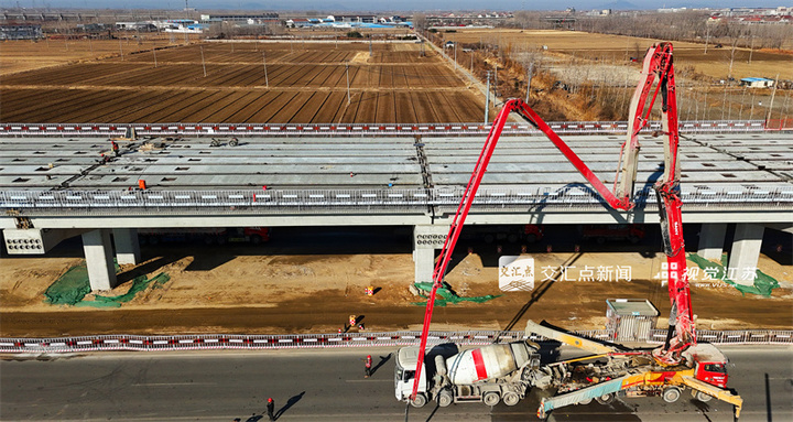 1月8日,连云港市,204国道赣榆城区段快速化改造工程正在加紧施工。近日,随着65米大跨度钢箱梁顺利架设,204国道赣榆城区段快速化改造工程高架桥上部结构施工全面提速,为后续施工奠定坚实基础。耿玉和摄视觉江苏网供图
