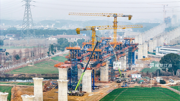 1月6日,工作人员在通苏嘉甬铁路张家港段建设现场有序施工。目前,通苏嘉甬铁路张家港段桩基、承台、墩身等下部结构施工完成99%,预计2月中旬,将完成剩余下部结构施工以及3联连续梁合龙,为后续架梁施工奠定坚实基础。任广真摄视觉江苏网供图