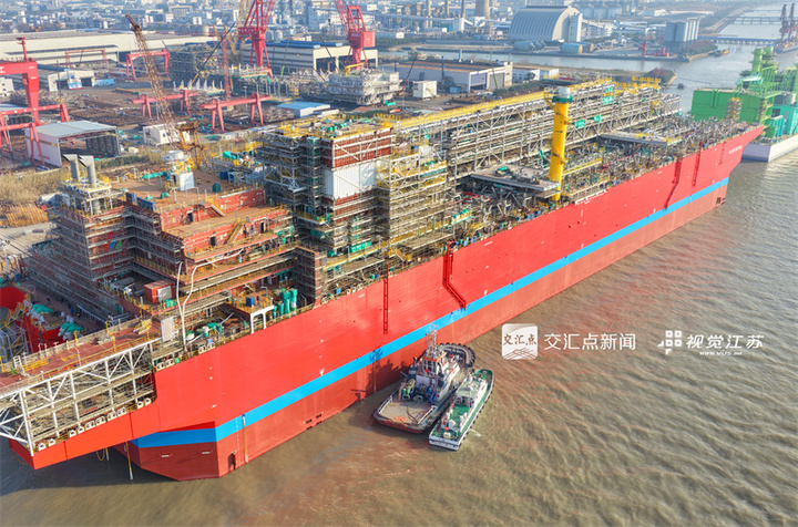 1月7日,在南通开发区惠生清洁能源南通基地拍摄日前顺利出坞的大型浮式天然气液化装置。该装置正式进入上部模块集成与系统安装等关键工程阶段。据介绍,由我国自主研发建造的这座大型浮式天然气液化装置全长320.8米,型宽60米,型深32.8米,设计年产能120万吨。项目建成后将部署于印度尼西亚西巴布亚省。许丛军摄视觉江苏网供图