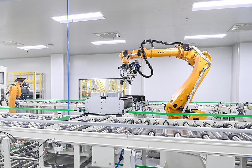 智泰储能电池项目的生产车间内,机器人手臂正在自动化生产。李思远摄