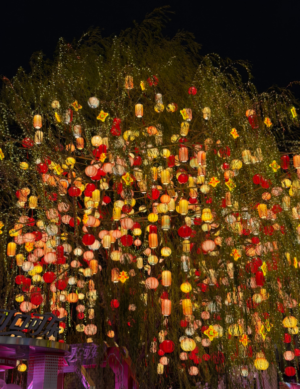 刘扬介绍,门东街区的大部分乔木都有自己的灯彩装扮,唯独三条营巷口的这棵柳树,从老门东开街伊始便陪伴街区一路成长,今年首次将这棵“福气满满”的柳树纳入灯会布置中,命名为“福柳门东映芳华”,装扮上999盏灯笼之后一炮走红。
