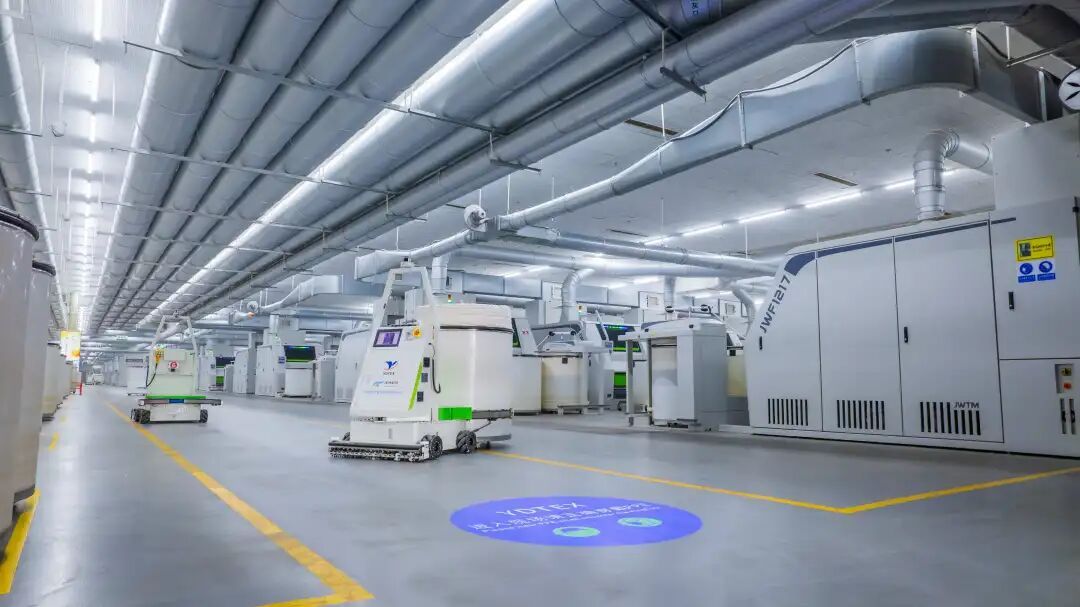 走进车间,昔日“机器轰鸣、工人穿梭”的景象早已不见,取而代之的是高速运转的数字化设备,机械臂精准完成络筒、并线的无缝衔接,AGV小车往来穿梭运送物料。