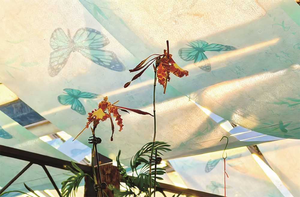 最引人注目的,莫过于几盆被匠心点缀的“大圣兰”。这款从中国台湾引进的品种,其舒展的花瓣形态神似齐天大圣的面容。工作人员仅以一缕金丝线轻巧点缀,便让整株花呈现出“手握金箍棒、脚踏筋斗云”的大圣经典姿态,栩栩如生。