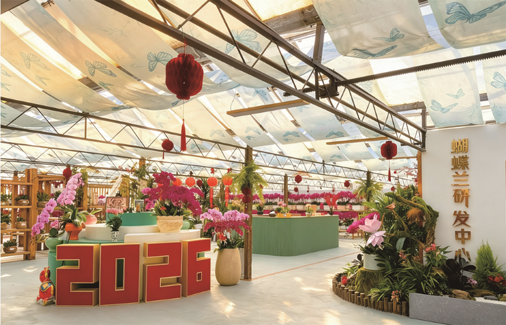 一踏入蝴蝶兰展示中心,年味就扑面而来。火红喜庆的“大辣椒”盆花整齐列阵,旁边还有用多株蝴蝶兰经巧妙设计组合而成的骏马与蝴蝶造型,寓意“马到成功”“花开富贵”。