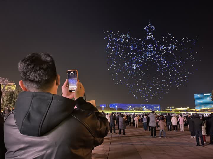如果说烟花无人机解决了“震撼度”,那么东寰的粒子飞行技术则攻克了“细腻度”的核心难题。该技术可助力无人机实现毫米级精准定位与复杂动态路径规划,彻底摆脱传统矩阵飞行“方阵步”的生硬感。“以前的无人机表演像看像素画,现在用粒子飞行技术,能够让无人机阵列呈现出柔美、立体且从任何角度观看都无死角的复杂图像,就像4K电影一样流畅细腻。”东寰技术人员童柯烊介绍。从明月湖畔的“玉人吹箫”到品牌定制的灵动图案,这项国内领先并已申请专利的技术,让东寰的“空中光影”拥有了前所未有的表现力,也成为其承接高端活动的核心竞争力。