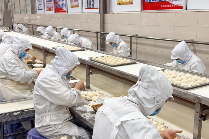 扬州丰禾食品有限公司生产车间里一片忙碌景象,白案师傅们手法娴熟,捏、提、翻、拉间,一只只形如“荸荠鼓”、收口似“鲫鱼嘴”的包子跃然掌上。作为扬州地区首家获得出口食品生产企业备案资质的老牌包子生产企业,丰禾食品总销量的10%销往海外市场。“元旦过后,我们进入了生产和出货高峰期,8条生产线全开,日产量可达35万至40万只。”丰禾食品常务副总经理李成忠表示,当前正加紧完成春节前最后一批海外订单,同时为“年蒸季”加班加点备料、备货。据悉,面对国际市场需求,在保持包子传统工艺精髓的基础上,当地企业通过建设高标准清洁车间、引进全自动智能生产线和速冻保鲜技术,推动产业向标准化、自动化、规模化转型升级。据统计,2025年,扬州海关共监管出口速冻包点2260吨,产品远销20多个国家和地区。