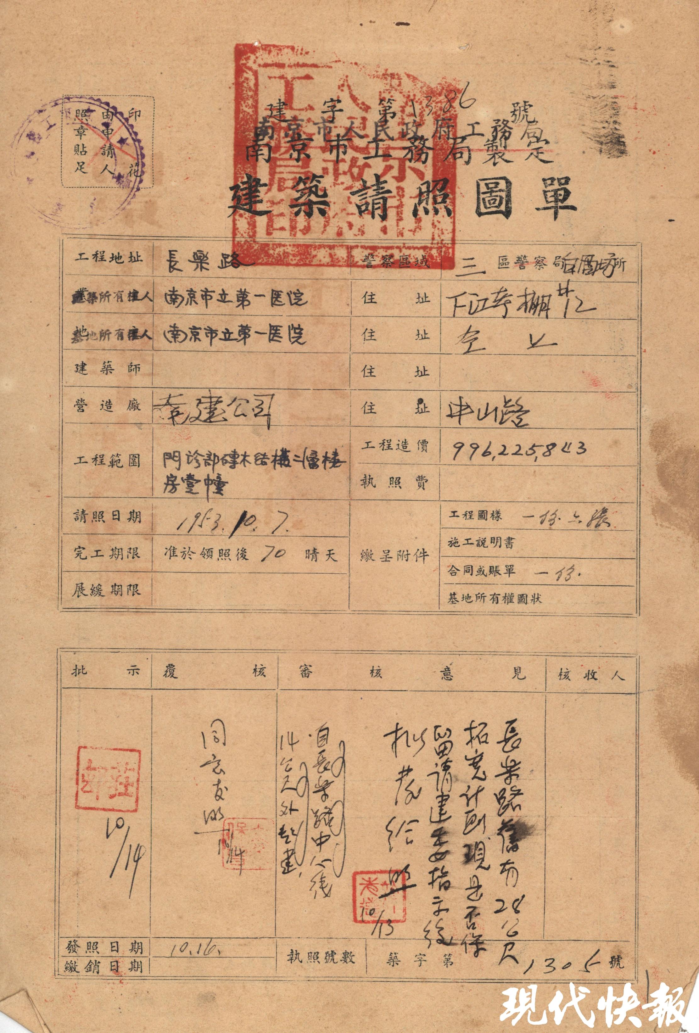 1953年,市第一医院门诊部建筑执照申请(图片来源:南京市城市建设档案馆)