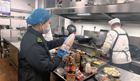 后厨、仓储以及餐饮具消毒间等一直是餐饮督查的关键区域。昨天下午,海州区市场监管局浦西分局和海州区市场监管局餐饮科联合执法人员来到朝阳路的悠仙美地酒店,首先进入后厨,除了检查食品加工过程和环境卫生外,还重点查看了食品原料的购进渠道。随后,对该酒店的仓储间进行检查,检查重点为调味品、食用油、米、面等食品的存储环境和生产日期、保质期等。此外,还对餐饮具洗消间、冷菜间等重点区域进行督查。