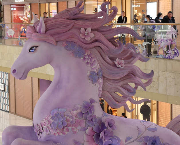 南京各大商圈的萌趣马造型各具特色,德基广场粉紫骏马梦幻可爱,成为年轻人打卡首选;金鹰新街口店的“木马奇旅”美陈打造童话场景,是亲子家庭的打卡胜地;弘阳广场灯会的神骏造型融合马鹿特征,萌趣灵动;南京市景枫中心外一尊高约7.6米的巨型马雕塑,外形圆润饱满。该雕塑原型参照唐代马匹形象,刻意以丰腴造型呼应唐代“以胖为美”的审美风格,象征国力强盛、生活富足。