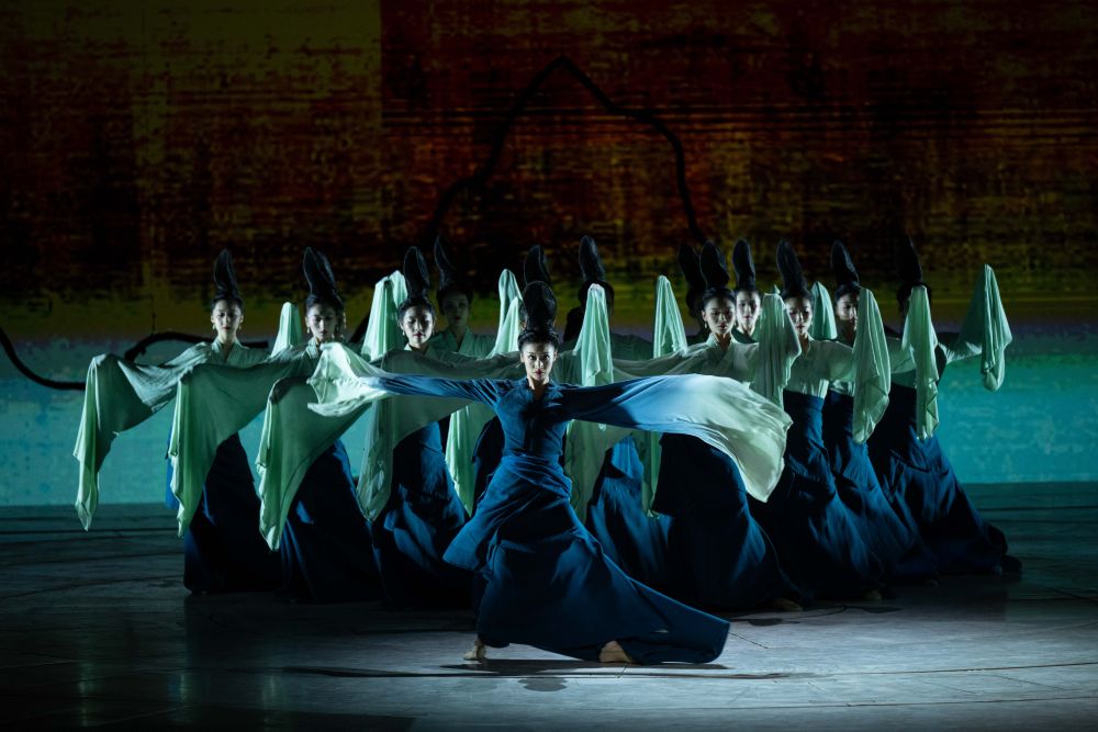 这是舞蹈诗剧《只此青绿》的演出剧照(2024年7月18日摄)。《只此青绿》采用平行空间的叙事方式,从故宫博物院青年研究员的“展卷人”视角出发,讲述北宋著名画家王希孟创作《千里江山图》的故事。该剧连续3年稳居中国舞剧票房榜首,全国巡演超800场,赴多个国家和地区演出50余场,成为传统文化创新表达、中国艺术国际表达的典范之作。
