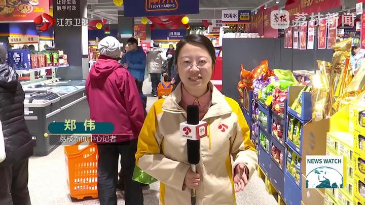 荔枝新闻中心记者郑伟说:“我现在是在南京奥乐齐超市。作为近期新开的品牌首店,这里可以说是年味十足、人气爆棚,不少市民全家出动,一站式采购年夜饭食材与新春礼品。”