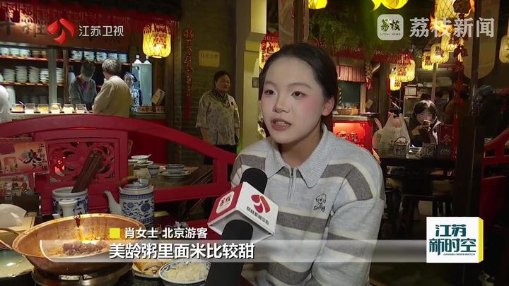 贵州游客谷先生说:“我觉得素什锦都挺好吃的,还有红豆酒酿圆子也比较好吃,我家乡那边的口味偏辣。”北京游客肖女士说:“挺好吃的,美龄粥比较好吃,里面米比较甜,我比较喜欢吃甜食。两人吃了100块钱左右,吃得比较饱,过年想过来看看江南的风光。”