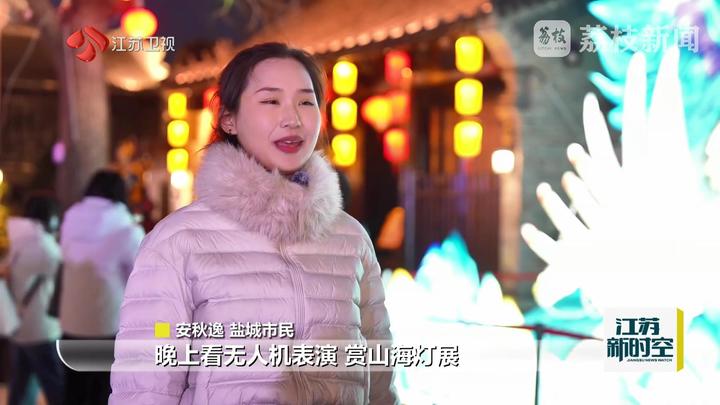 盐城市民安秋逸说:“晚上看无人机表演、赏山海灯展。灯光打得特别美,就像走进了画里一样。还有非遗民俗轮番上阵,年味特别浓。”