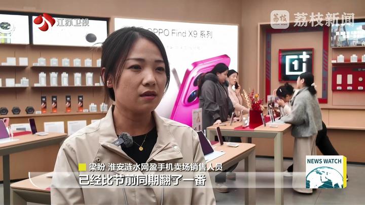 淮安涟水网盈手机卖场销售人员梁盼说:“我们春节假期前几天的销售额已经比节前同期翻了一番。其中,符合国补条件的数码智能产品占比超过了八成。”