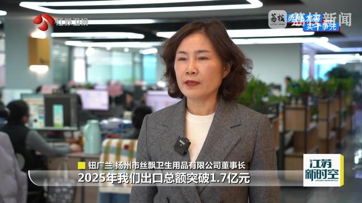 扬州市丝飘卫生用品有限公司董事长钮广兰说:“2025年公司出口总额突破1.7亿元,较2024年增长14倍以上。”
