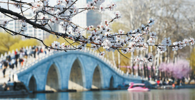 春和景明,北京玉渊潭公园春花争艳,春意盎然,吸引众多游客前来踏青赏花。