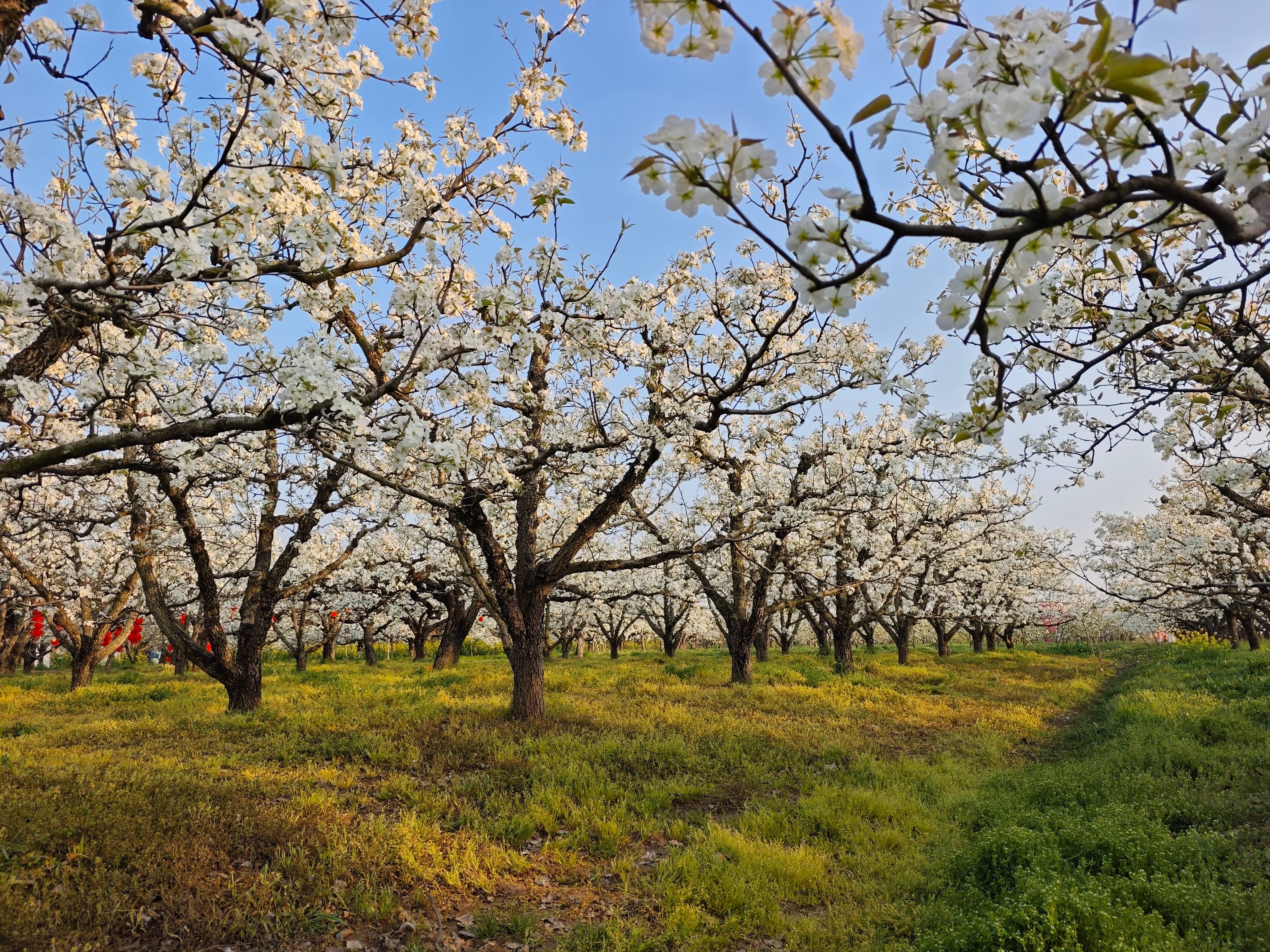 4月的江苏省徐州市铜山区徐庄镇梨园,满枝梨花正开得似雪如云,梨树下挤满了围着专家发问的果农。