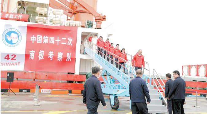 4月9日,中国第42次南极考察队队员走下“雪龙”号。
