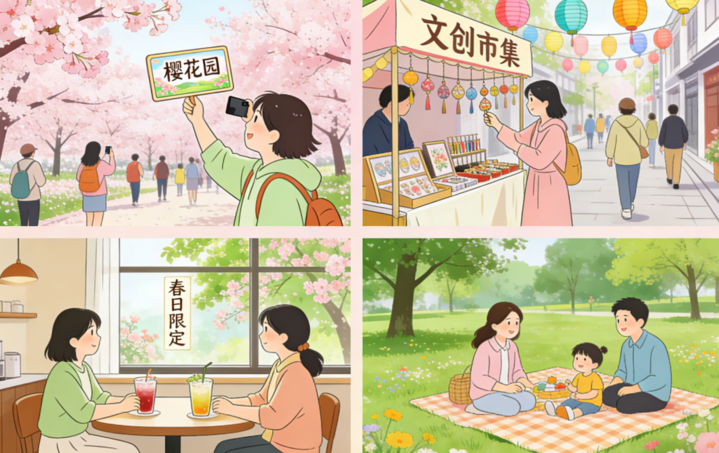 “春光美景”点燃消费热潮。春风拂过,繁花盛开,观赏大好春光,既是专属于春日的仪式感,也是当前最热门的出游主题。各地以花卉景观为核心,做足“花”文章,做活“春”文章,不断拓展“赏花+”新业态边界,把单一的赏花观光,升级成了集休闲、娱乐、餐饮、体验于一体的全域旅游场景,拉长为可持续的消费链条。贵州贵安樱花园以70余万株樱花为底色,将路边音乐会、屯堡地戏、国风巡游嵌入花海,让游客在春光里沉浸式感受自然与文化的双重滋养;湖南长沙望月公园以樱花为媒、以汉文化为魂,打造“沉浸式体验+场景化消费”的春日文旅新范式,让赏樱成为一场浸润心灵的文化之旅;浙江龙港将古琴演奏搬进油菜花海,周边布局特色咖啡店、空笺书局、乡村博物馆等业态,打造“赏花+文化+休闲”模式,让游客在赏景之余,愿意停留、乐于消费……这些创新实践,让春日场景既有颜值更有内涵,精准撬动消费潜力。