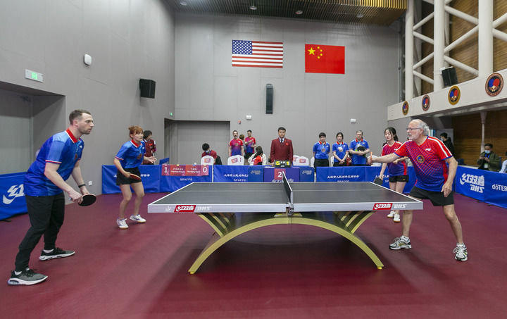 2021年4月10日,上海举行纪念中美“乒乓外交”50周年系列活动。这是中美选手参加乒乓球友谊赛。新华社记者王翔摄